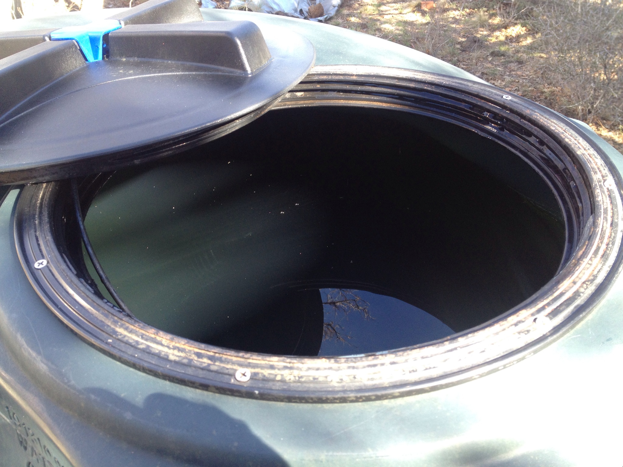 My 1000 gallon tank was nearly full by early February. Some off-season summer rain then topped it off again in early July… Need to use more water!