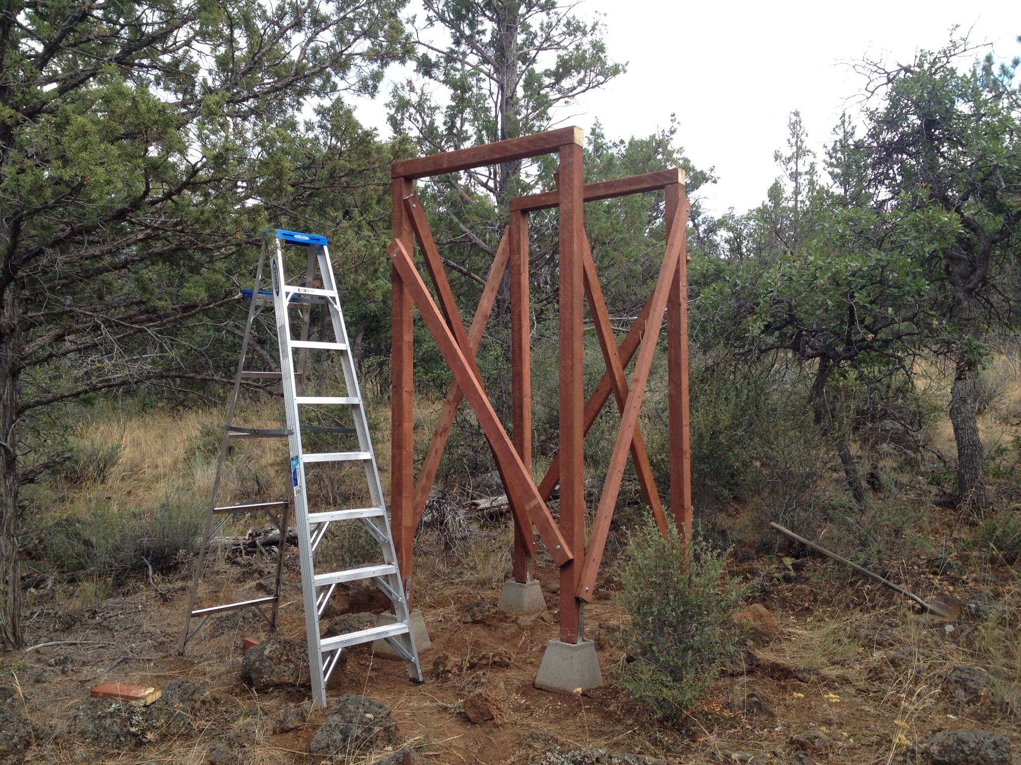 Water Tower 2.0, standing. The posts are 8ft tall, so the top is about 9ft off the ground. This is also probably the sturdiest structure I’ve ever built…